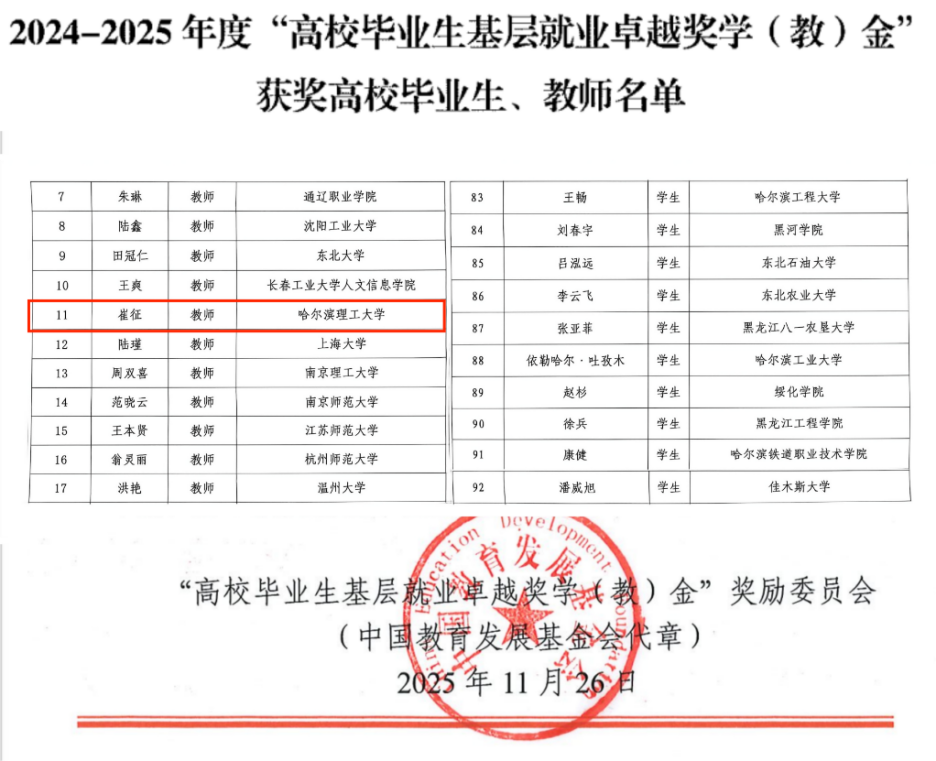 近日,2024-2025年度“高校毕业生基层就业卓越奖学(教)金”获奖名单正式公布。我校大学生就业服务中心副主任崔征获该奖项教师荣誉(全国58名教师获奖,黑龙江仅1名教师获奖)。