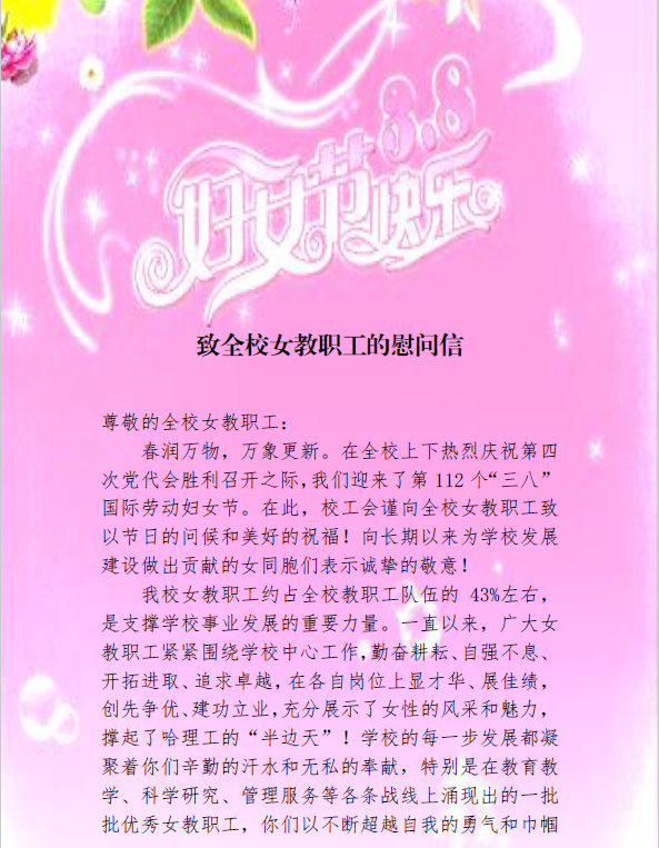春润万物,万象更新。在全校上下热烈庆祝第四次党代会胜利召开之际,我们迎来了第112个“三八”国际劳动妇女节。在此,校工会谨向全校女教职工致以节日的问候和美好的祝福!向长期以来为学校发展建设做出贡献的女同胞们表示诚挚的敬意!