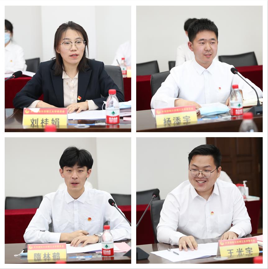 校团委学生副书记杨添宇、校学生会执行主席隋林鹤、研究生会执行主席王光宇、研究生支教团成员王鑫淼、大学生艺术团成员姜浩尔、校学生会成员张爽、追光话剧社成员马松源、校团委文体艺术部副部长王文卓、研究生会成员田野等9名青年团员代表先后进行了发言。他们表示,作为新时代的青年,要做到听党话、跟党走,时刻铭记习近平总书记的殷切希望,以青年人朝气蓬勃的姿态,展现新时代青年最亮丽的底色。