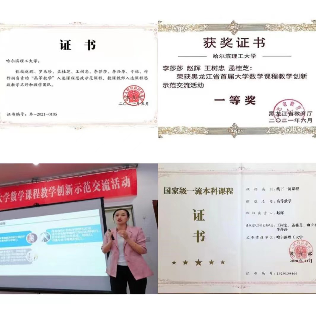 在李莎莎的不懈努力之下,到目前为止她指导学生获国家级一等奖3项,二等奖9项,三等奖18项;省级一等奖4项,二等奖3项,2021年,李莎莎被评为全国大学生《非数学专业》数学竞赛黑龙江赛区优秀指导教师。