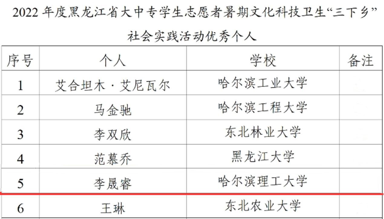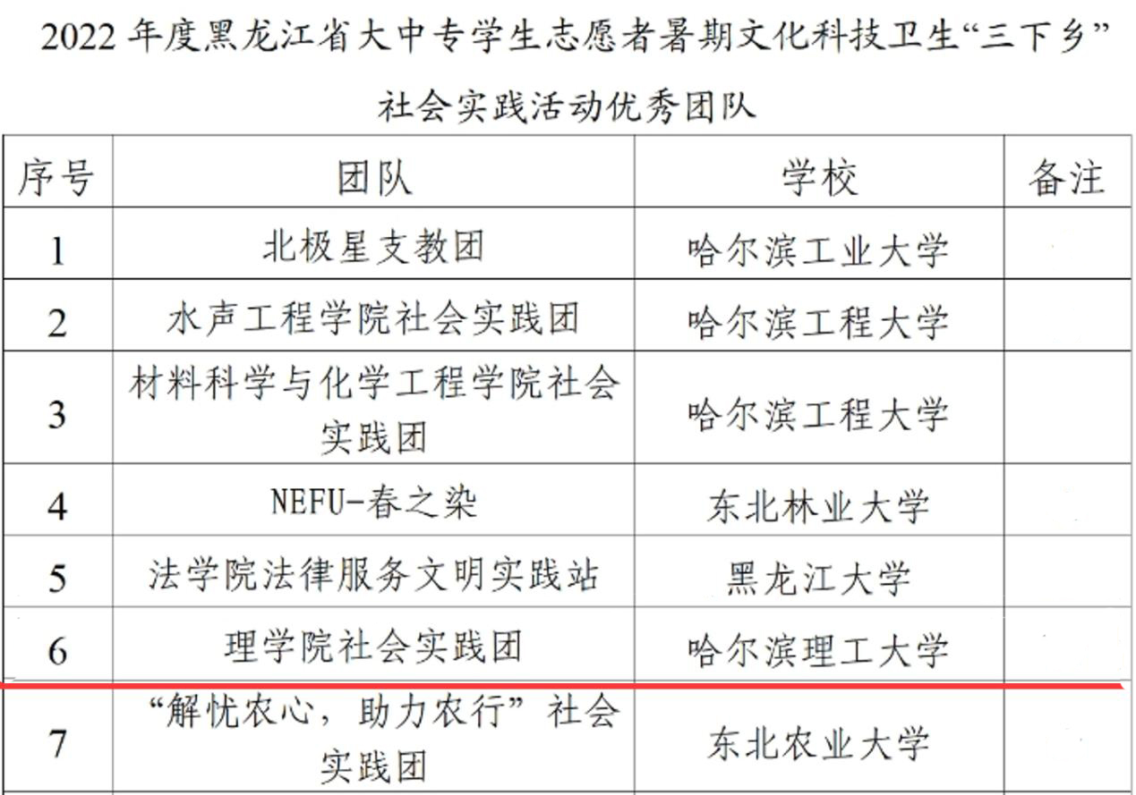 近日,团中央和团省委分别对2022年大中专学生志愿者暑期文化科技卫生“三下乡”社会实践活动中表现突出的先进集体及个人进行了总结表彰,我校喜获多项国家级、省级表彰。其中,理学院社会实践团被评为全国“2022年度‘三下乡’社会实践活动优秀团队”、校研究生会被评为“2022年度黑龙江省‘三下乡’社会实践活动优秀单位”、理学院社会实践团被评为“2022年度黑龙江省‘三下乡’社会实践活动优秀团队”、我校教师李晟睿同志被评为“2022年度黑龙江省‘三下乡’社会实践活动优秀个人”。