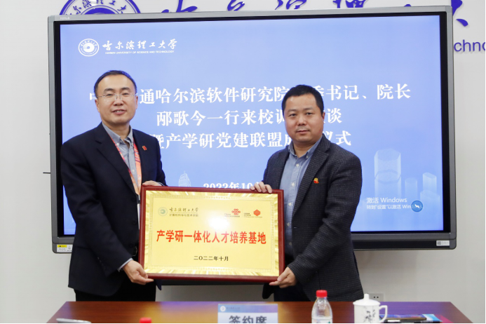 在党建联盟成立仪式上,孙广路与邴歌今分别代表哈尔滨理工大学计算机科学与技术学院党委、中国联通哈尔滨软件研究院党委签署了产学研党建联盟合作协议。黄海与牟海刚参加产学研一体化人才培养基地授牌。