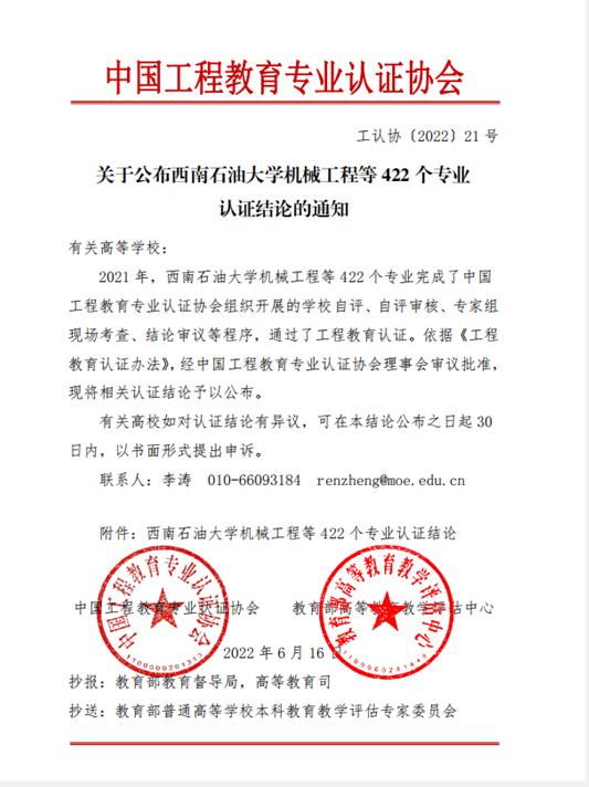 6月25日,中国工程教育专业认证协会发布了2021年度工程教育专业认证结论,我校高分子材料与工程、化学工程与工艺、安全工程3个专业正式通过认证,有效期6年(有条件),认证有效期起止时间为“2022年1月至2027年12月”。截至目前,我校共有16个专业通过工程教育专业认证,数量居省属高校首位。同时,认证协会还发布了2021年度中期审核结论,我校机械设计制造及其自动化、无机非金属材料工程、电气工程及其自动化、电子信息工程、环境工程5个专业顺利通过中期审核,各专业的认证有效期截止时间明确为2024年12月。