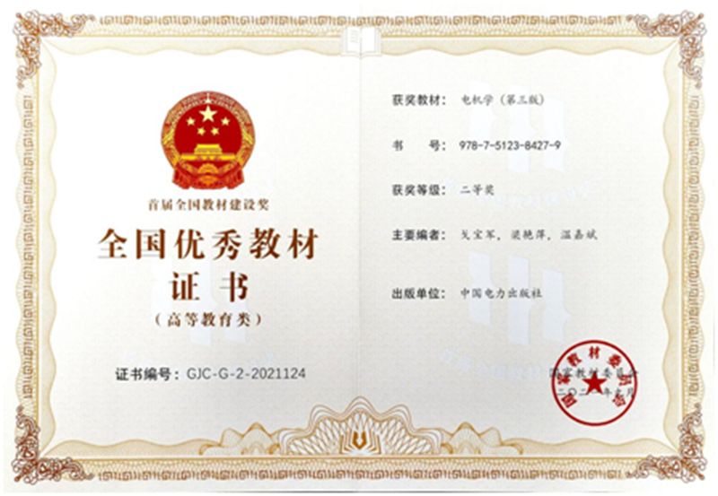 由戈宝军、梁艳萍、温嘉斌教授编著的《电机学(第三版)》(中国电力出版社,2016年2月)获评首届全国优秀教材奖(高等教育类)二等奖,全国教材建设奖由国家教材委员会主办、教育部承办,每4年评选一次,是国家教材领域的最高奖。《电机学(第三版)》为“十二五”国家级规划教材,“电机学”课程于2007年被评为国家精品课,2013年在“爱课程”上线,2014年在学银在线建成MOOC,2016年被认定为国家精品资源共享课,2017年被评为省精品在线课程,2019年被评为省线上线下混合式一流课程。课程组连续多年被高等教育出版社、中国电力出版社聘为全国电气名师大讲坛名师和课程培训专家,对全国500所余高校专业教师进行课程、教材、教学培训,得到了广大师生的高度好评。