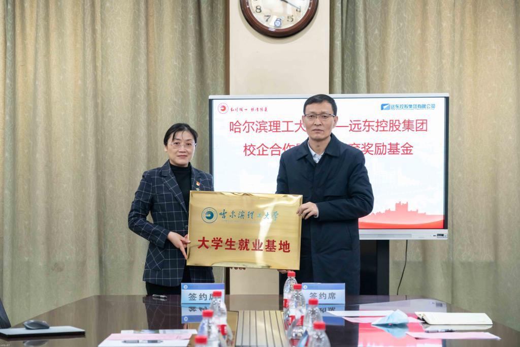 会谈结束后,双方进行了校企合作及远东教育奖励基金签约仪式。随后,郭加利与企业代表举行了校企共建“大学生就业基地”授牌仪式。