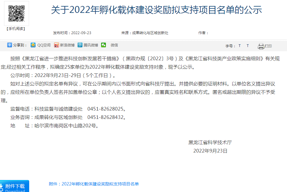 根据《黑龙江省科学技术厅黑龙江省财政厅关于印发黑龙江省科技类产业政策实施细则》(黑政办规〔2022〕3号)及《黑龙江省科学技术厅关于组织申报2022年孵化载体建设奖励的通知》,由我校科技园申报,省科技厅组织专家评审“黑龙江省2022年度孵化载体建设奖励项目”,我校科技园成功获批最高额度100万元,此项目为《新时代龙江人才振兴60条》项目,充分体现了有关部门对我校科技园作为优秀孵化载体培育企业高质量发展的肯定。