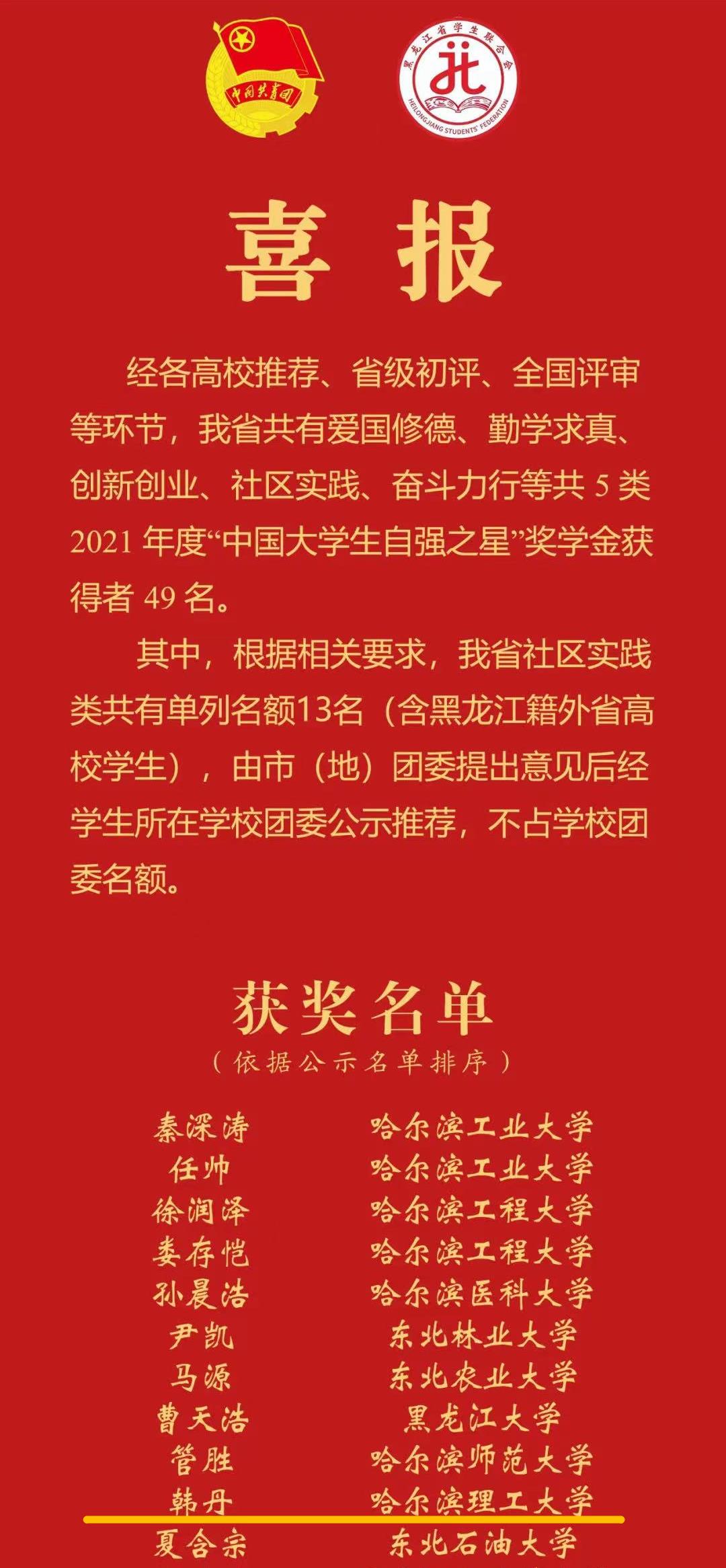 由共青团中央、全国学联指导,中国青年报社等联合举办的2021年度“中国大学生自强之星”奖学金评选活动结果揭晓。其中,我校第七届研究生支教团成员2021级研究生日语笔译专业韩丹同学荣获“中国大学生自强之星”称号,我校学子连续四年获此殊荣!