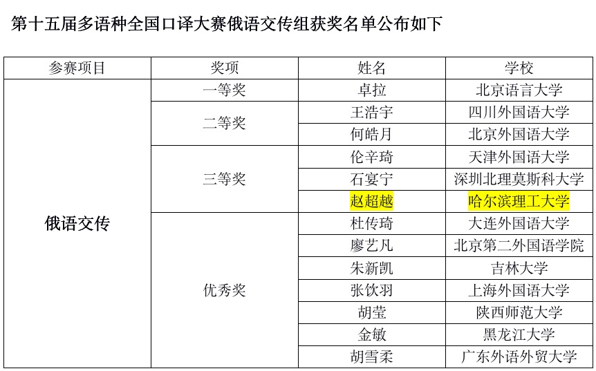 11月6日,“永旺杯”第十五届多语种全国口译大赛在“云端”落下帷幕,外国语学院俄语19-2班赵超越同学在一众外语类院校选手中突出重围、斩获俄语交传组三等奖!向全国口译大赛的各位专家、评委展现了哈理工学子的拼搏与努力、水平与实力。