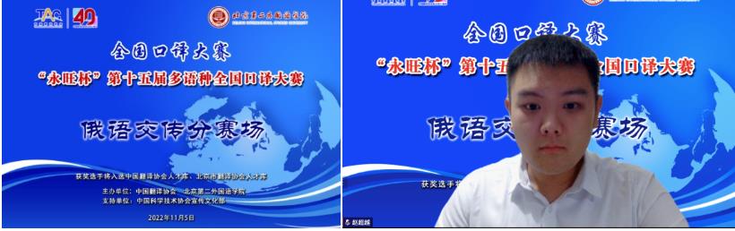 “永旺杯”多语种全国口译大赛由中国翻译协会、北京第二外国语学院共同主办。本届大赛共包含日语、法语、德语、俄语、朝(韩)语、西班牙语、阿拉伯语等7个语种,内容涉及时政、外交、经济、科技及人文交流等多个领域。经初赛选拔,共有来自国内外51所高校的116名选手进入复赛。经过激烈角逐,赵超越同学以复赛第三名的成绩进入全国总决赛,与来自北京语言大学、四川外国语大学、上海外国语大学、广东外语外贸大学、天津外国语大学、浙江大学等外语类强校的众多选手同台竞技,并脱颖而出,斩获俄语交传组三等奖。