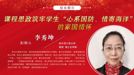 第一讲由国家一流课程负责人、国家级研究生课程思政示范课程获得者、国家级课程思政教学名师、教育部精品视频公开课主讲人、黑龙江省教学名师,哈尔滨工程大学李秀坤教授作《课程思政筑牢学生“心系国防、情寄海洋”的家国情怀》主题授课。李秀坤教授分别从教育部、省内及学校三个层面就打造课程思政示范课程及导学思政团队进行了介绍。并就打造课程思政“一院一品”项目提出了新的建设思路。