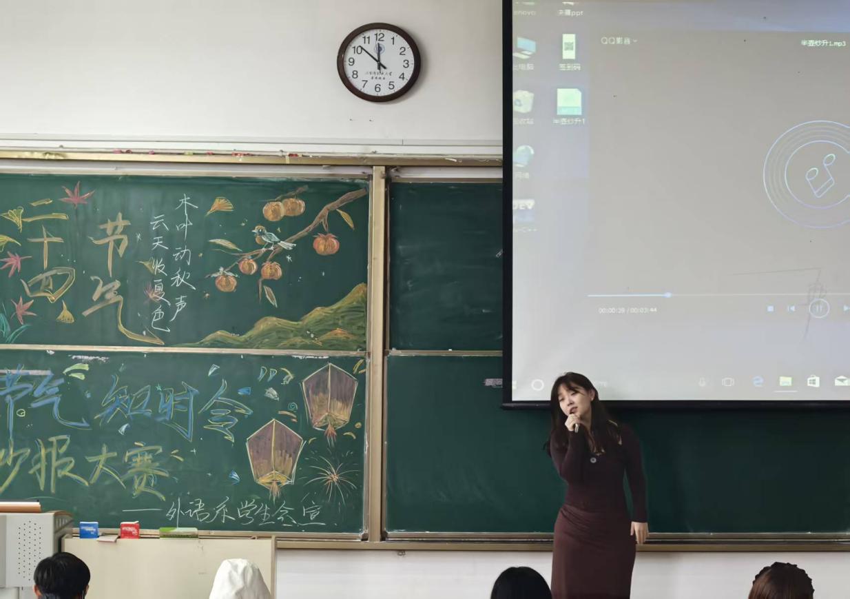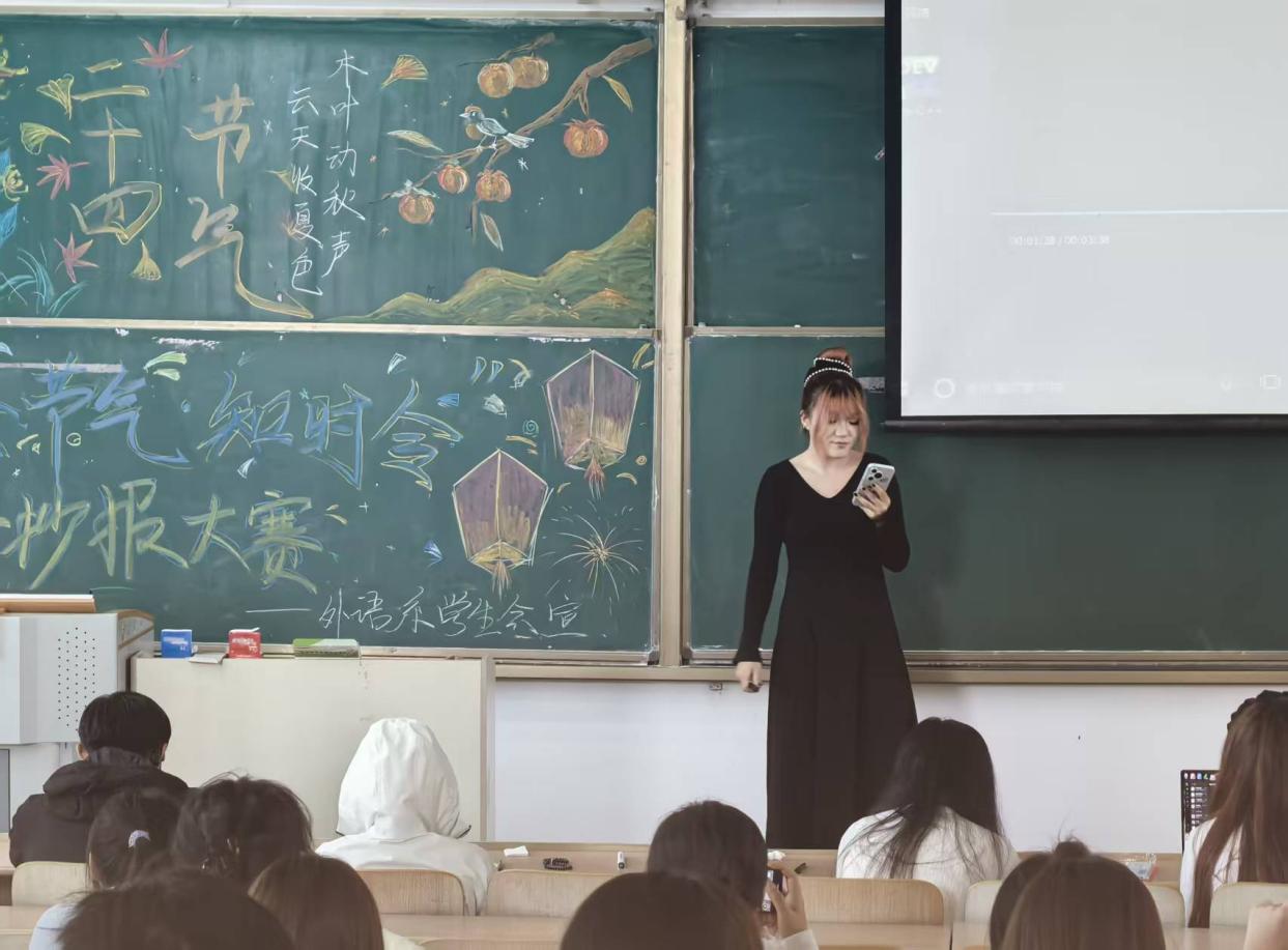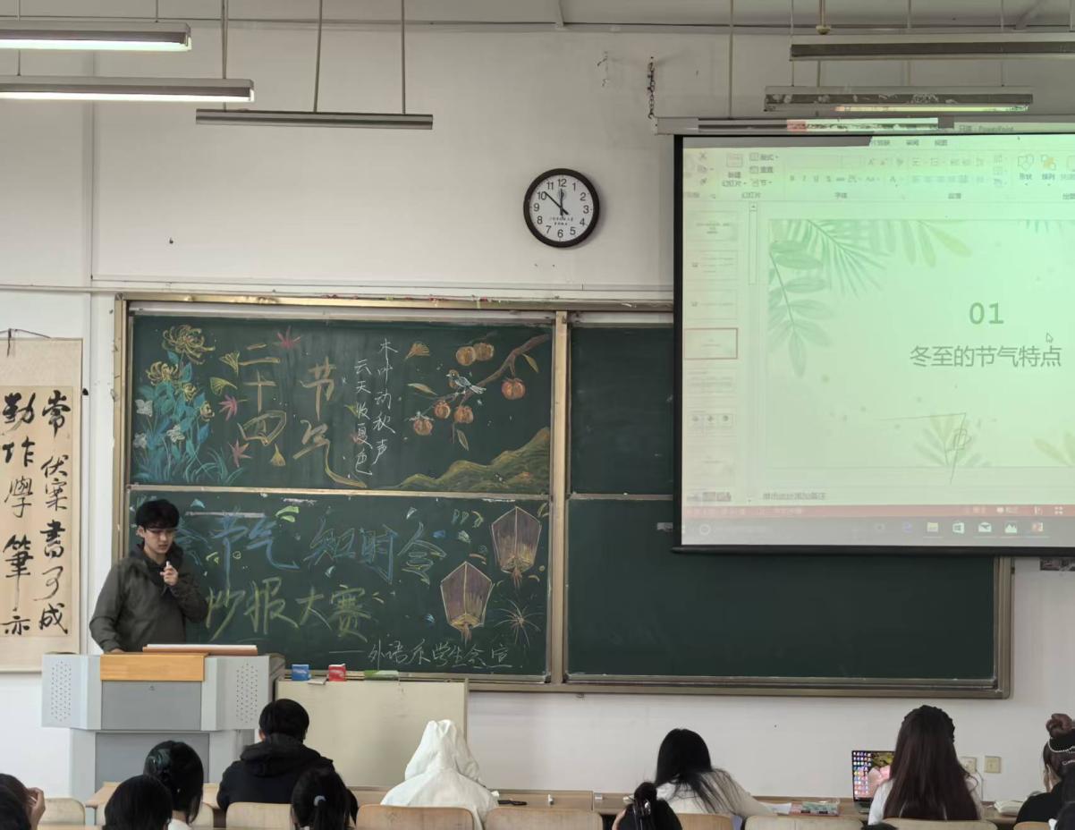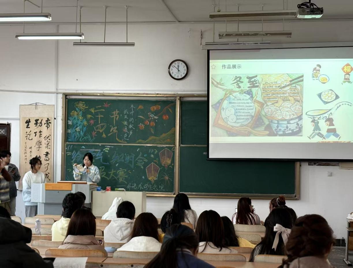 11月9日,为传承中华优秀传统文化,及对二十四节气的认知与理解,外语系成功举办“绘节气 知时令”手抄报大赛。参赛者们带着不同节气的绘画作品登上讲台,讲述着独属于自己的一份见解。