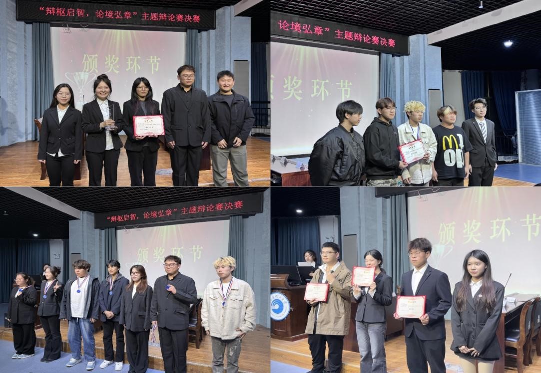 决赛辩论环节结束后,工作人员根据评委们的评分依次评选出了一、二、三等奖,优秀团队及优秀辩手,获奖选手身着整齐服装登台,各位评委依次为获奖者颁发奖杯、奖牌和荣誉证书。