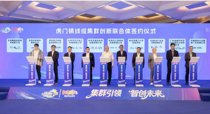 为整合创新资源、加速成果转化,本次大会上,“虎门镇线缆集群创新联合体”正式组建。该联合体由维峰电子、东莞中探探针、领亚电子科技等6家行业领军企业牵头,联合广东省循环经济和资源综合利用协会、东莞市虎门信息传输线缆协会、哈尔滨理工大学荣成学院、中国检验认证集团广东有限公司等多方力量,构建起“政产学研用”深度融合的长效创新机制。