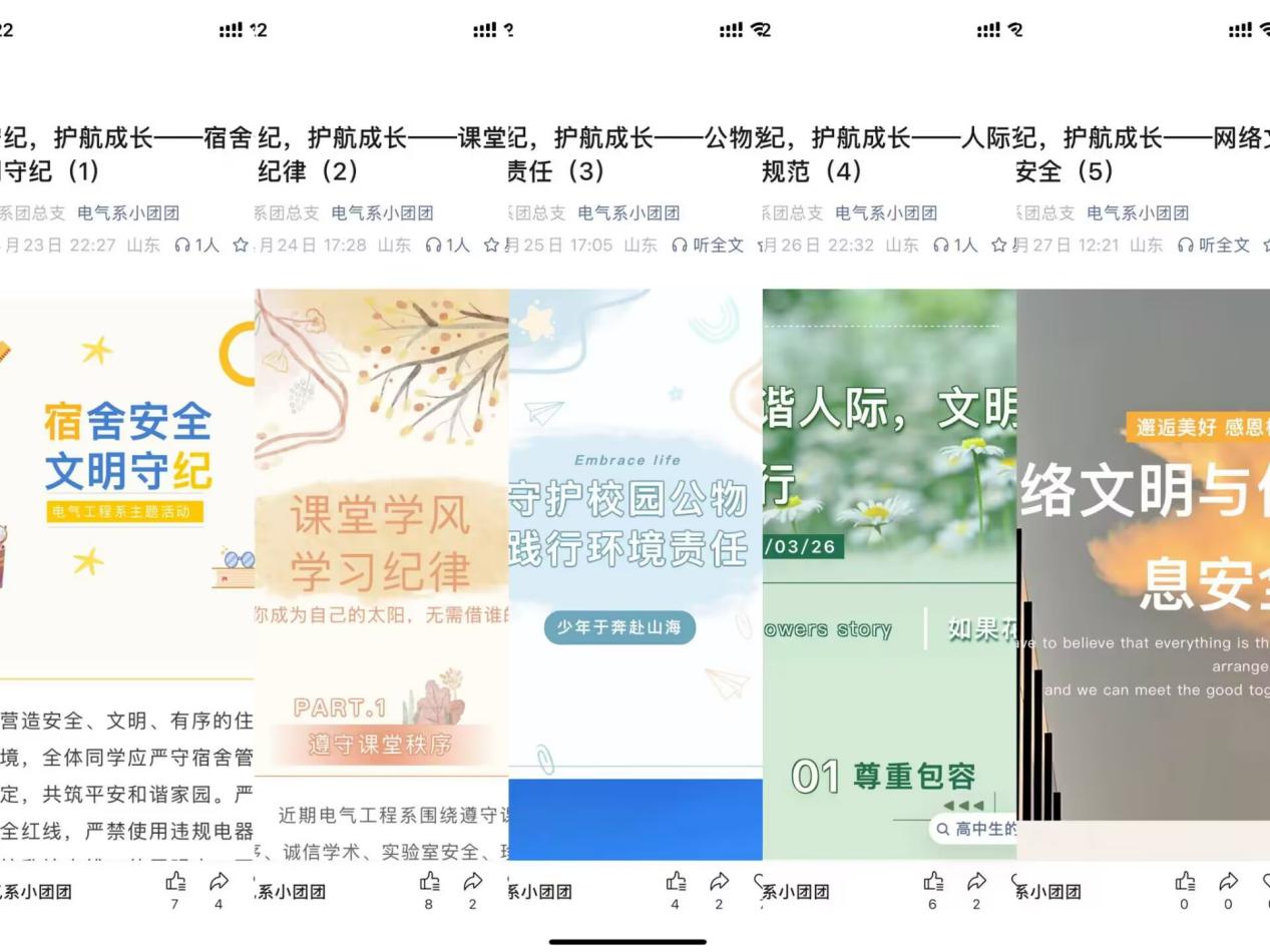 电气系团总支依托微信公众号,持续推送涵盖宿舍安全与文明守纪、课堂学风与学习纪律、公物爱护与环境责任、人际交往与行为规范、网络文明与信息安全等主题教育推文,引导学生增强规矩意识、规范日常行为。各寝室以“守纪律,讲安全,树新风”为主题开展讨论,学生们结合自身实际交流遵规守纪心得,共同探讨如何共建安全、文明、和谐的寝室环境。