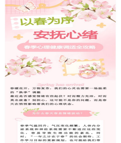 科普入心,护航成长。春天被称为“情绪流感”高发期,受生理、气候、社会心理等因素影响,大学生容易产生心理状态的波动。针对这一特点,学院开展春季心理健康知识科普,通过公众号、班级群等方式广泛宣传,增强学生对心理健康现状的关注,掌握自我调适技巧,营造“人人关注心理、人人善爱自我”的良好校园氛围。