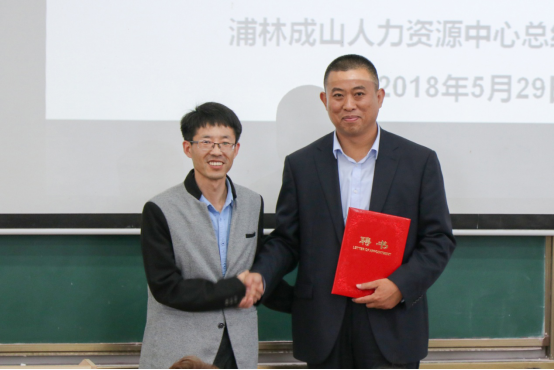 学生工作办公室副主任张庄庄为浦林成山(山东)轮胎有限公司人力资源中心总经理刘维才颁发校外指导教师聘书