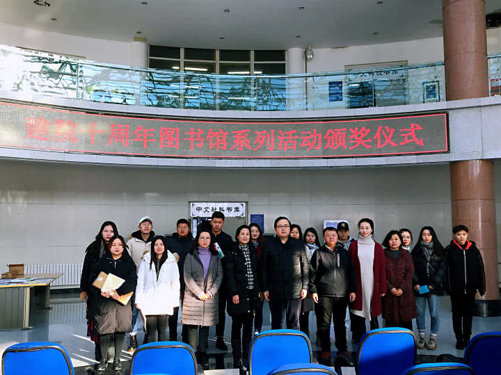 系列活动的颁奖仪式在12月29日举行。学院院长徐向晨、副院长张桂华、图书馆馆长马向东、副馆长张闫、借阅部主任鞠红静、综合业务部主任郭丽媛等为获奖人员颁奖并与获奖人员合影留念。