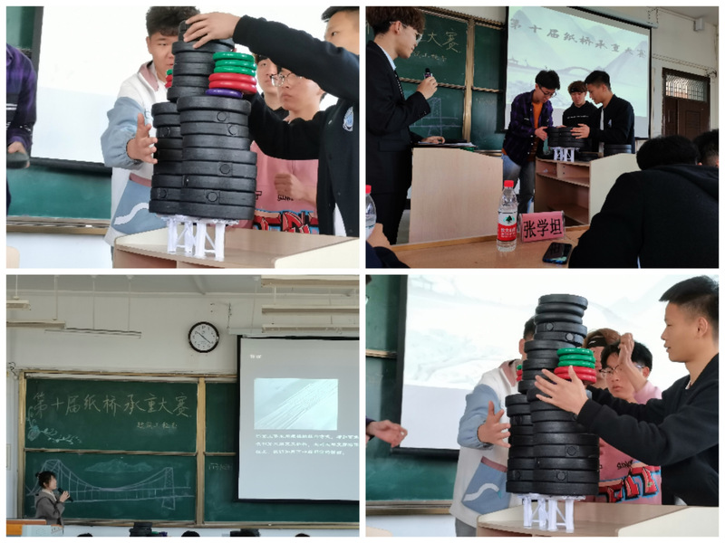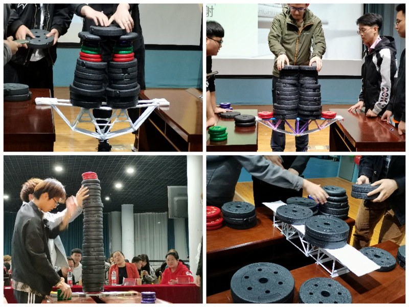 决赛开始由大学生艺术团带来热烈的开场舞,随后每支队伍首先向观众展示自己的作品、PPT讲解纸桥创作理念并现场测试纸桥承重情况。最激动人心的就是在测量纸桥承重的环节,一个一个砝码加载在纸桥上,主持人及时详细的解说,桥的镇定自若到轻微颤抖再到形变,同学们的心也跟着颤抖,现场的欢呼声,喝彩声,声声入耳,在欢呼声中本次比赛完美落幕,嘉宾老师为获奖队伍进行颁奖,全场掌声雷动。纵观整个比赛过程,优秀的作品层出不穷,所制作的纸桥外观落落大方,承重能力令人称奇。最后由指导教师殷升为本次比赛做出精彩点评与闭幕总结。