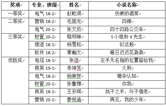 继图书漂流、文献检索知识竞赛和阅读之星评选活动之后,图书馆知行读书社于4月13日至5月20日举办的“小说创作大赛”活动又吸引来自全院9个专业36位同学报名参加,最终收到12位同学小说作品。同学们用细腻的文笔刻画人物性格,通过完整的故事情节展示学生们的社会生活,在其中领略到了别样的风景和人生。经图书馆邀请评委老师评审,获奖名单如下。(摄影:郭丽媛)