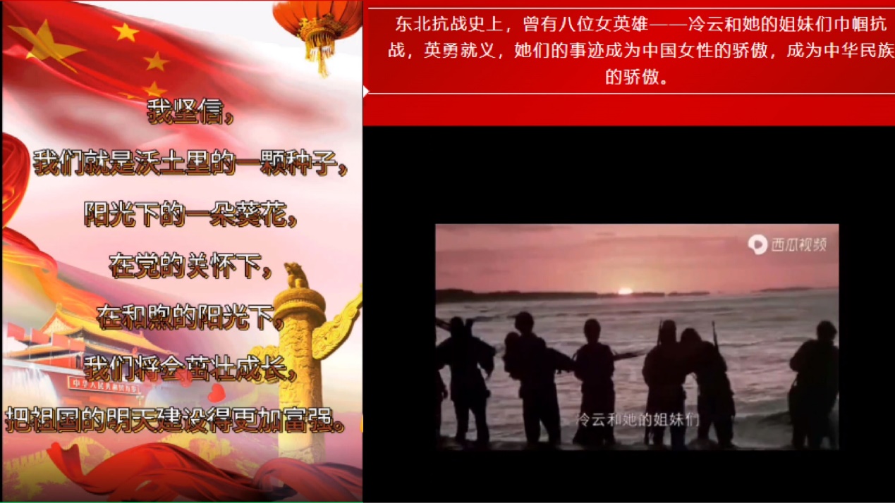 活动采取以单人,寝室,小组为单位的形式,讲述红色经典故事,通过搜索资料结合自己的理解来录制一段视频。同学们积极参加,重现了中国人民在共产党领导下艰辛奋斗的历程。我们在其中选出了三个优秀的作品:女英雄刘胡兰的传奇事迹,生的光荣死的伟大;张晶麟的英勇牺牲,她的形象永远会光耀在他热爱的人民心中;冷云和她的姐妹们巾帼抗战,她们是中国女性的骄傲。