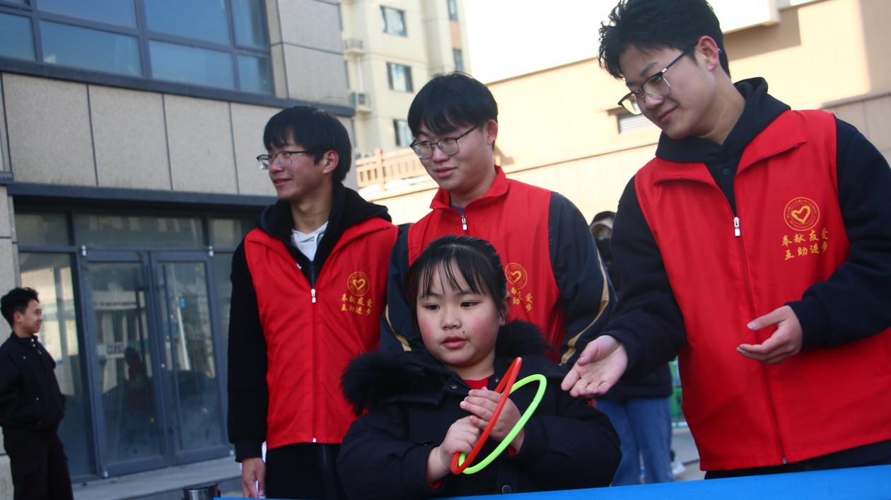 市集现场,学院学生协助布置游戏摊位、引导居民参与互动。学院志愿者们穿梭在人群中,用耐心与热情感染着每一位居民,让大家参与其中。这场充满童趣的公益实践,不仅让邻里在游戏中打破隔阂,更让“志愿”二字在学校从口号化作触手可及的温暖——当最后一份礼包送达老人家中,志愿者们手中的游戏道具早已超越了娱乐意义,成为爱心传递的载体。