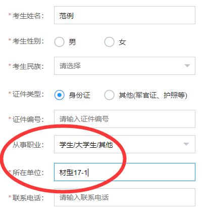①“所在单位”必须按照本人学生证首页上的“班级”信息填写,格式如:材型17-1;