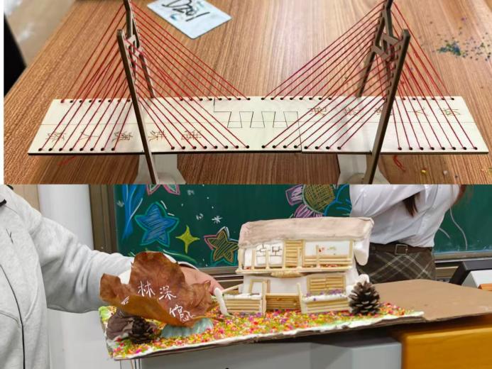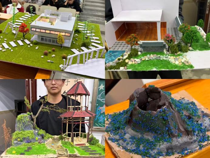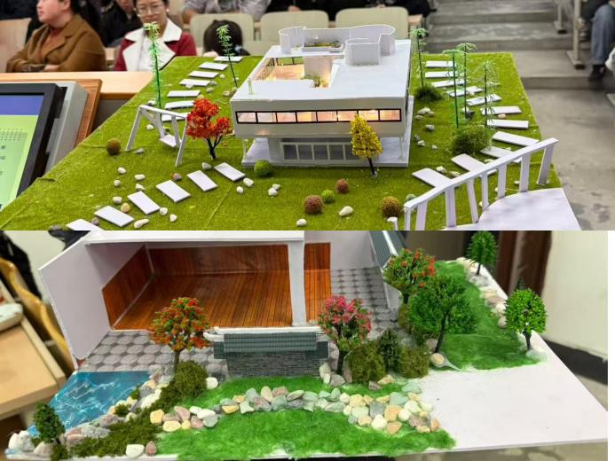 当晚,入围决赛的十支队伍依次登台,带着精心打磨的建筑建模作品与制作精美的 PPT,展开了激烈角逐。各队伍代表结合模型实物与图文演示,从设计理念、结构创新、功能适配、环保理念等多个维度,详细阐述了作品的创作思路与核心亮点。来自材料成型及控制工程专业的“世界建筑大师队”,以山水风情为主题,意在打造青山绿水,与世无争的世外桃源“听松亭”;来自环境设计专业的“技术小分队”则将绿色理念融入现代建筑,创造出充满温馨,雅致的现代别墅:来自食品科学与工程专业的“蛋仔派队”以当代年轻人心理压力大为切入口,创造性地制作出“树洞”这一可以宣泄压力的好工具;来自环境设计和智能建造工程专业的“对对对你说的都队”希望在这个快速发展的社会中,找到一处静心养神的好去处“养心苑”。新颖的创意、扎实的专业功底与生动的讲解,不仅充分展现了同学们的创新思维与实践能力,更深深吸引了现场观众,赢得阵阵掌声。
