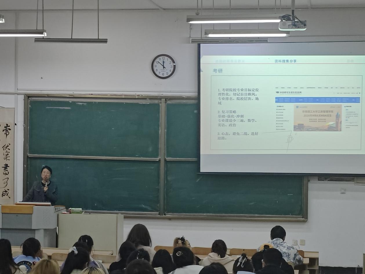 关于考研,赖老师分享了近两年我系的考研情况,为准备考研的同学们提供了院校与专业的选择方向。结合往届上岸学姐学长的学习经验,她给大家勾勒了清晰的备考路线,从公共课与专业课学习节奏把控,备考资料的去芜存菁,到心态调节与压力疏导,逐一拆解考研路上的关键节点。她的分享逻辑清晰、干货满满,为志于深造的同学们驱散了迷茫与焦虑。
